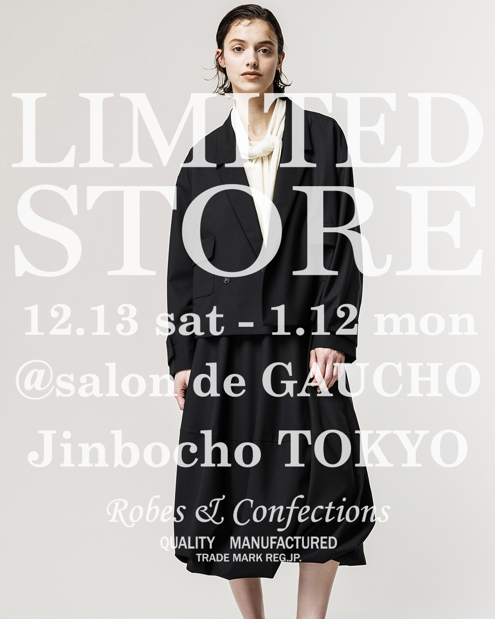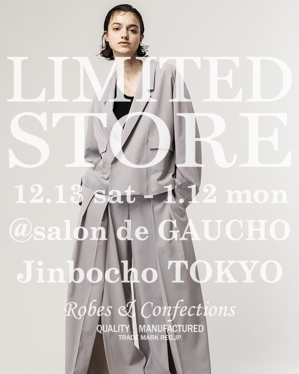 12月13日(土)からsalon de GAUCHO にてRobes & Confections LIMITED STORE がスタートします。2025-2026 A/W コレクションよりウィメンズとメンズの厳選されたアイテムをご覧いただけます。